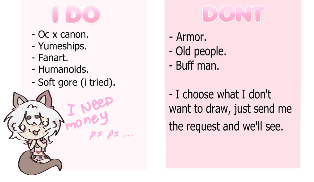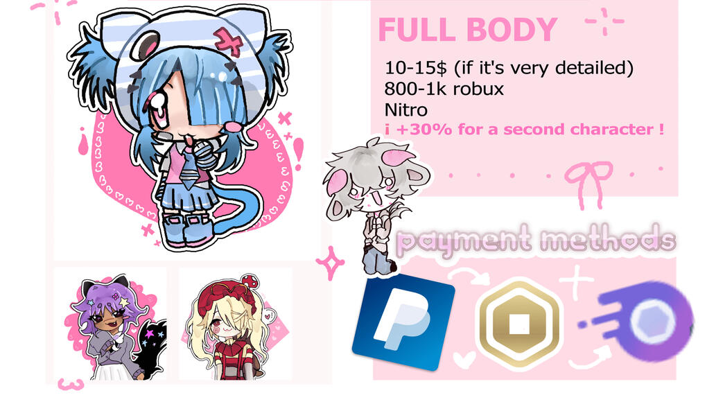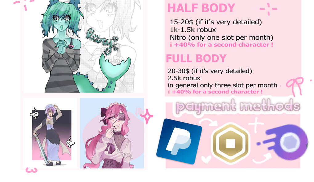 1.You need to pay after the sketch, No refunds after approved lineart.2. If you want specific custom size for your artwork, please mention that in your request.3. The deadline will be discussed beforehand. Usually it takes around 1 week or more, depending on the complexity.4. If you want to see the progress, you can contact me via my Discord, Email or where you asked for the commission, and i can make some minors changes while I'm doing the commission.5. Payment will be via Paypal / kofi / robux / nitro sometimes (ask if it is valid at the moment)6. All commissions will have a small watermark version and not watermark vrs.